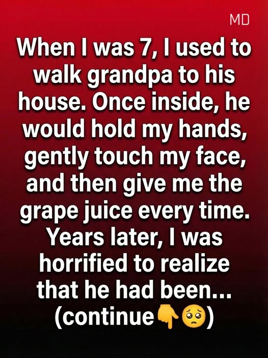 When I was seven, visiting my grandfather was part of my weekly routine. I would proudly walk beside him from the corner store to his small house at the end of the street, feeling important because he trusted me to guide him home. Once inside, he always followed the same gentle pattern—he’d hold my hands, look closely at my face as if memorizing every detail, then smile and pour us both a glass of grape juice. To me, it was just our special ritual. He never spoke much, but his quiet attention made me feel safe, as though those simple moments were the highlight of his day.