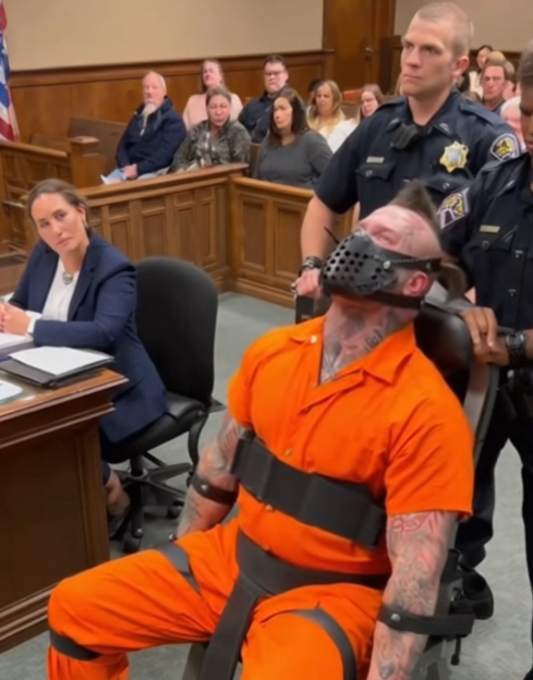 The man immediately jerked against his restraints, shouting in shock and anger. His voice cracked as he screamed at the judge, shaking the heavy metal chains in a visible mix of disbelief and fury. Court officers, who had been closely monitoring him throughout the hearing, quickly stepped in, ready to react if the situation escalated any further. Despite being chained to the chair, the defendant attempted to stand, but officers pressed on his shoulders, forcing him back down.