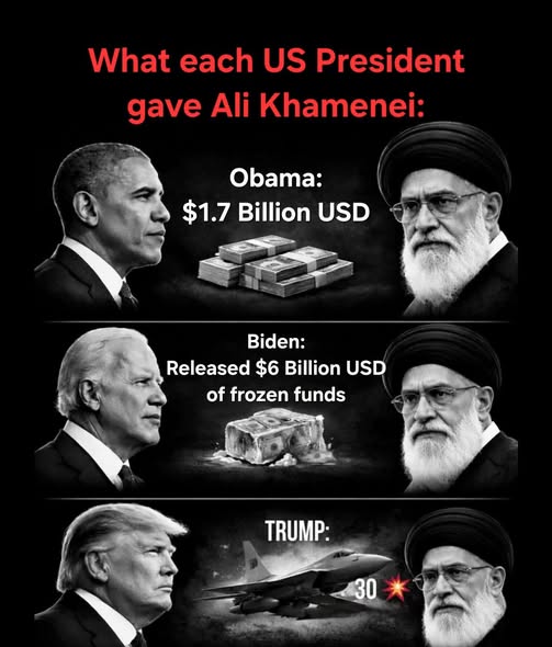 The image you shared is a politically charged meme summarizing U.S.–Iran relations by depicting what each U.S. president “gave” to Iran or to its Supreme Leader Ayatollah Ali Khamenei. It lists Obama: $1.7 B, Biden: released $6 B of frozen funds, and Trump: (military action) —