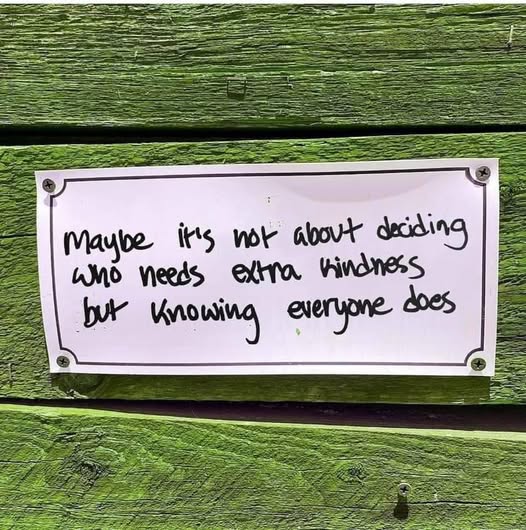 A sign I once saw said: “Maybe it’s not about deciding who needs extra kindness but knowing everyone does.” That message lands because it’s true. We don’t always see what people are carrying. The cashier might be managing grief. The student might be overwhelmed. The neighbor who seems distant may be lonely. The person who looks confident may be silently struggling. Kindness doesn’t require us to guess who “deserves” it—kindness asks us to remember that everyone needs it.